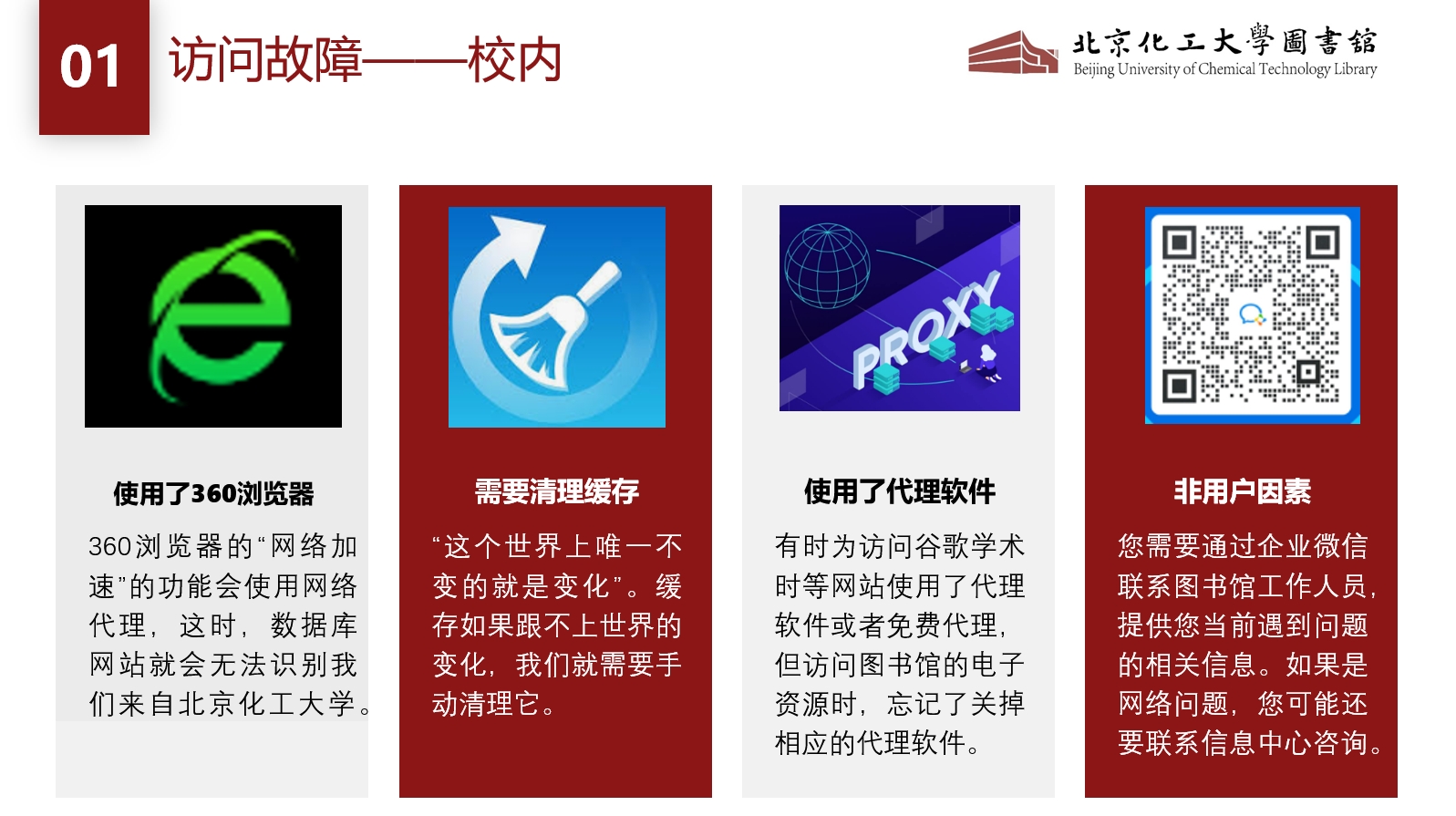 如果前三种情况都排除了,并且当前您周围的其他电脑也有类似的问题,请您立即扫描页面最下方的二维码,向图书馆报告您发现的问题。如果您周围的电脑没有问题,那您遇到的情况也是相当有趣的案例,也欢迎您扫码入群咨询,图书馆的老师也乐于为您解决问题。